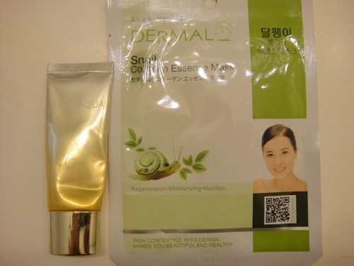 Dermal snail collagen essence mask Regeneration, moisturizing, nutritionMissya Super Aqua cell renew snail sleeping mask目と口の周りが乾燥してしまったので、もうカタツムリが気色悪いのを我慢してミシャのスーパーアクアという洗い流さないパックを買って、箱を開けてみたらチューブの裏に小さく目と口の周りを避けろと書いてありました。韓国製のマスクは日本製品より安く、破れにくいのですが日本モノより肌への刺激が強く、敏感肌の方には合わない場合があります。ダーマルも目の周りがちょっと痛かったので早めに外し、首や腕に使いました。私としてはダーマルの方が使いやすく、冷蔵庫で冷やすと気持ちよかったのでお勧めです。