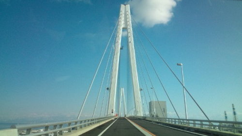 前回富山に来た時は建設中だった、新港大橋に高所恐怖症の友人と行ってみました。サンフランシスコのゴールデンゲートブリッジやベイブリッジ、横浜ベイブリッジをバイクで飛ばすのが好きだった私としては、夏にバイクで来ようと思っただけですが、友人は怖くないか???おーこわ、何でこんな所で停めるがよーーー!と騒いでいました。何でも、歩行者が風で吹き飛ばされる可能性があるから工事し直しだとか。それは、、、確かに怖いですね。