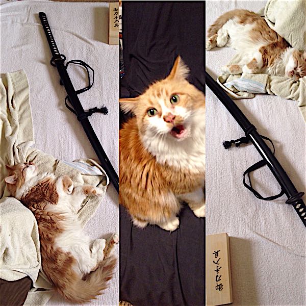 旦那のベッドにオモチャの刀とネコが、、、。 ネギさん、毛が沢山抜けるから毛布はやめて欲しいけど、好きなのね。