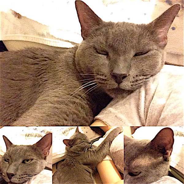 ロシアンでぶーは怖い顔ですが、実はゴロゴロと甘えている最中です。 お腹を触ろうがびっくり返そうが、絶対私を引っ掻きません。 私の肩の上に頭を乗せて頭突き、寝てると顔や首に手を伸ばしてきます。