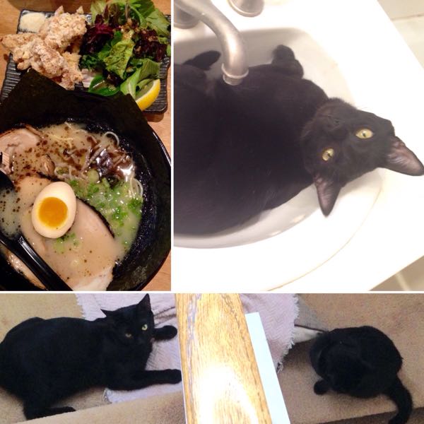 Fukumimi Ramen, shio tonkotsu and Kara age. 唐揚げはケンの大好物(=^ェ^=) 友人の猫を預かって3日目、ウチのトライオン3はチームを組んで縄張り争いは続きます。 デミアン、暑いからシンクがお気に入りみたい。