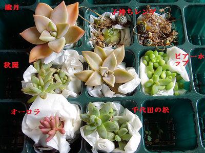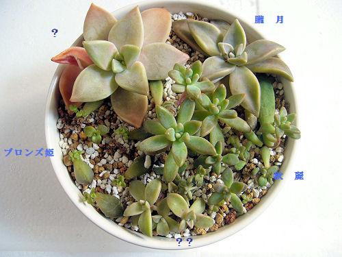 先日頂いた多肉便の中からグラプト属だけで寄せ植えを作ってみました。それだけでは足りないので葉挿し途中のブロンズ姫を育苗鉢から駆り出して。・・予想通り上手く出来ませんでしたなんてったってセンス無いんだから。。この日記にアップする前に別の場所でこの寄せ植えの写真を公開したところ意外な事が判明しました。朧月2株だと思ってたのが違う種類で桜月という素敵な名前の品種かもしれないと。あと秋麗の下に植わっている2~3株の色の薄いのは朧月のちょびっこだと思ってたけどこれも違うような気がしてきましたこれらの名前、ご存知の方いらっしゃいましたらお教えください。宜しくお願いします♪