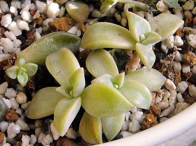 前回の不明品種が判り嬉しくなったので第2弾をやっちゃいますね~(他力本願っこ )こちらも頂いたグラプトスペシャルに入っていた多肉さんですもしかしたら朧月のちびっ子かもしれませんが少し葉に艶があるんですよ~一番大きな葉で縦が1.5cm横0.8cmです。ブロンズ姫の葉挿しっ子が1個写り込んでいますが無視してくださいご存知の方いらっしゃいましたらご一報を頂ければじんじゃは嬉しいッス♪一年の最後の最後までこんな日記で申し訳ありませ~ん一年を振り返って・・今まで観葉植物のブログを書いていましたが今年9月に思い切って多肉専門のブログも開設してしましました。開設したのはいいけれど多肉だけで果たして続けて行けるのだろうか?という不安も暖かい皆様のお陰でなんとか続けられることが出来ましたこのブログを開設しなかったら知り合うことも無かったであろう他社ブロガーさんとの交流も出来て毎日どんなにか楽しかったことか。来年はもっと書き込みをして沢山の方とお友達になれたらなぁ~と思っています。その時は宜しくお願いしますね~♪2008年も残り僅かとなってしまいましたが皆様にとって来年が素晴らしい1年でありますように・・☆