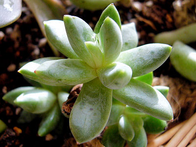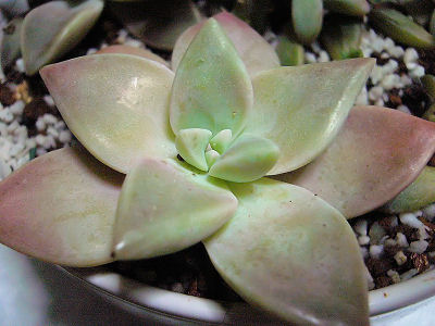 もう直ぐ2008年も終わりですねあわただしい中、皆さんはどう過ごされてますか?私はいつもと変わらずマイペースでわが道を行く・・?なので年末年始も暇を持て余しております。この時とばかり日記を更新しちゃうかもしれません。同じような境遇の方いらっしゃいましたらどうぞお付き合いくださいませ(笑)さて、年越しする前に不明多肉さんの名前がどうしても知りたくて皆様にお知恵を拝借以前頂いた多肉さんの名前がどうしても知りたくてご存知の方いらっしゃいましたらコメントの方宜しくお願い致します。朧月よりも葉の幅が広くかなりの肉厚な葉をしています。今は色褪せてきましたが家に来た当時は葉が(フルーツ牛乳みたいな)オレンジ色でした。この株で直径10cmくらいです。
