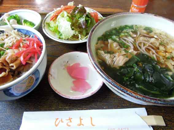 石井町の国道192号沿い、レストハウス「久善」で昼食をとりました♪今日は少し肌寒く・・・たくさんあるランチメニューの中から「日本そばと豚丼」を選びました♪ここの「日本そば」が美味しいのです♪とってもシンプルな「そば」です♪夏になると「ざるそば」になりますが、これがまた美味しい(^O^)♪「乾麺」を茹でているようなのですが・・・本当に美味しいのです♪「豚バラ肉」と「天かす」と「ワカメ」がのっています!! 「豚丼」です♪普通のお茶碗くらいの大きさです♪「豚バラ」を煮たものや「もやし」がのっています♪別名「徳島丼」・・・「徳島ラーメン」の「具」を「ごはん」にのせたものです♪美味しくいただきました♪これで650円です(^O^)♪