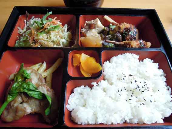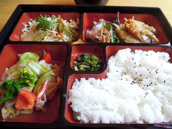 今日は肌寒い1日でした・・・。吉野川市山川町のアメリカンステーションで昼食をいただきます♪「日替わりランチ」は「豚肉のスタミナ炒め」と「ししゃものゴマ天ぷら」でした!! 「豚肉のスタミナ炒め」です♪「野菜炒め」ですネ(^O^)♪「菜の花」がオシャレです♪ 「ししゃものゴマ天ぷら」です♪美味しかったです(^O^)♪隣は「きんぴらごぼう」と「里芋の煮物」でした!!(*^_^*)♪