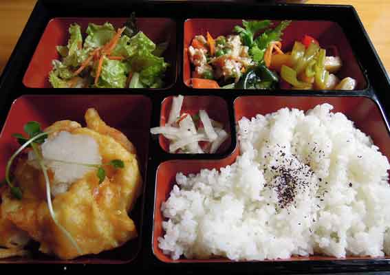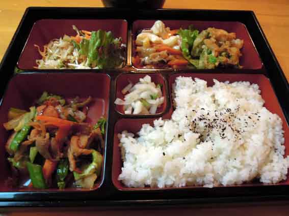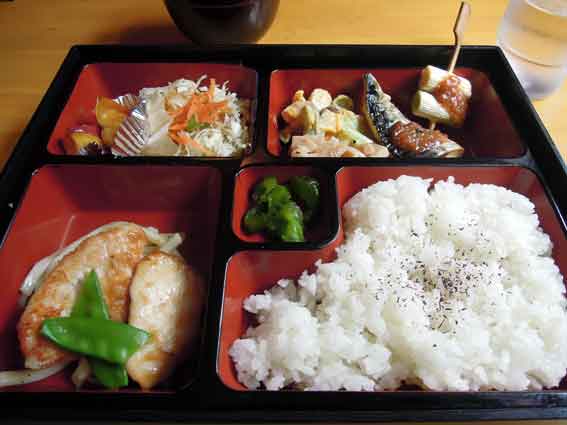 今日は時折雨の降る天気でした・・・。でも・・・思っていた程は降りませんでした・・・!!吉野川市山川町のアメリカンステーションで昼食です♪「日替わりランチ」は「鶏の生姜焼き」と「鯖のみそ焼き」でした!! アメリカンステーションでよく登場する「鶏の生姜焼き」です♪美味しいですヨ!!「鯖のみそ焼き」です!!左下は「タケノコ」の煮物♪その上は「豆」などをマヨネーズで和えたものです♪(^O^)♪
