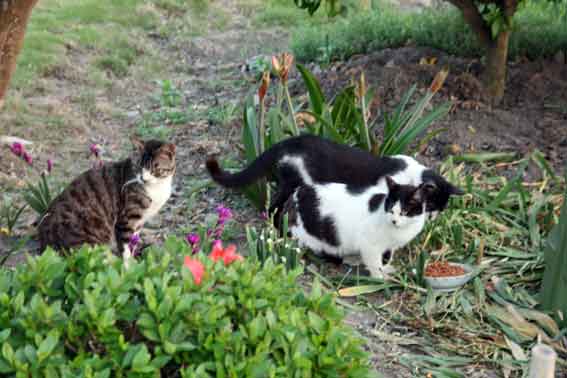 おはようございます♪今朝も午前5時半に起床、そろそろトライアルイラストの製作にとりかからないといけません・・・!!6月8日(土)から、鳴門市のJR鳴門駅裏のキョーエイ4Fで「イラスト展」を開催する事になっています♪期間は一週間です♪9日(日)の午後から「ワークショップ」を頼まれて、イラスト作成の様子を公開します!!作品の準備から、ワークショップの準備と、ちょっと忙しくなりそうです♪今朝のニャンコは、トラ吉とマメ吉とあずきです♪ トラ吉です♪庭に餌場が設けられていました♪あずきが納屋の餌場へ行きづらいので??・・・ここに餌場を特設(笑)したみたいです♪o(^▽^)o