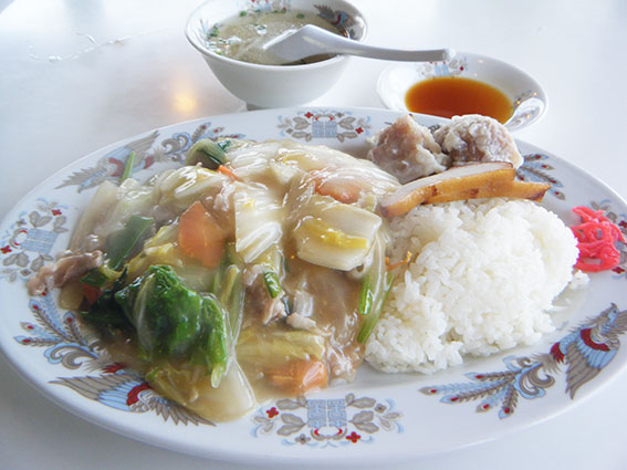 暑かった・・・(汗)!!今日も仕事で徳島県西部の三好市池田町へ行きました!!午後1時で気温は30度・・・(ー_ー)!!少し遅い昼食をね帰り道の東みよし町の中華料理「菊花楼」でいただきました♪「中華ランチ」です♪揚げ麺の上に、野菜たっぷりのあん!!焼売2個に、チャーシュー2枚(●^o^●)♪690円也!!美味しかったです\(^o^)/しかし・・・暑い・・・。