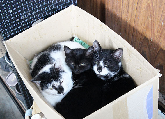 おはようございます♪猫団子~~(^O^)♪寒い朝を迎えています!!まだ外は暗いのですが・・・屋根には雪があるようです・・・!!今朝のニャンコは、寄り添って暖をとる、シロちゃん、ハナちゃん、チビクロの三匹です♪手を入れると・・・ポッカポカですヽ(*´∀`)ノ 場所は、私がオートバイの車庫替わりに使っている建物です♪この三匹はいつも仲良く寝ています♪ 道路が凍結していたら・・・大変です!!今日は少し早目に出勤しませんと・・・!!
