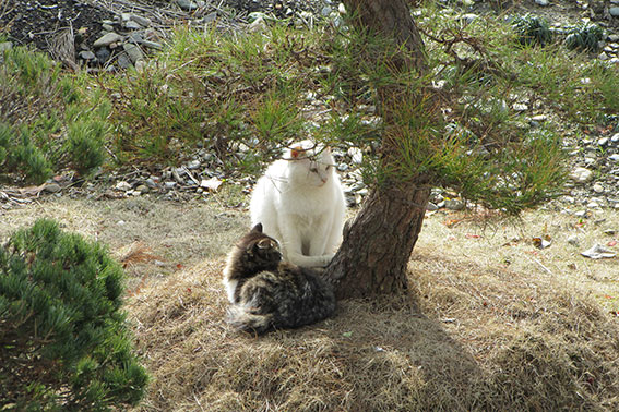 おはようございます♪今日は冬至!! 朝起きたら・・・雪が積もっていた・・・Σ(゚д゚lll)!!あれれれ・・・どうしましょ・・・。昨夜はそれほど冷え込みもなく・・・雪が降るなんて・・・??!!まだ暗いので・・・明るくなってから車で出勤出来るのか、JRで行くのか決めます!!今朝のニャンコは、 白猫ジャンボとダンディくんです♪庭の松の木の下、松の葉が積もっていて、ふかふかなんです♪ダンディくんのお気に入りの場所なんですが・・・白猫ジャンボも遊びに来ていますヽ(´▽`)/ 雪の中にジャンボがいたら・・・見えない・・・(笑)!!年末が近づき・・・雪は・・・困ります・・・。ヽ(;▽;)ノ