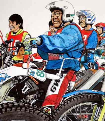 イラスト中央のおじさん(笑)は、トライアル専門誌「ストレート・オン」の編集長です(*⌒▽⌒*)♪