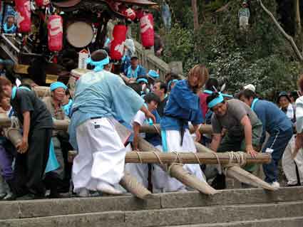 屋台の下には4本の足が出ていて、屋台を肩よりも高く持ち上げていないと石段に屋台の足が引っ掛かってしまいます・・・。