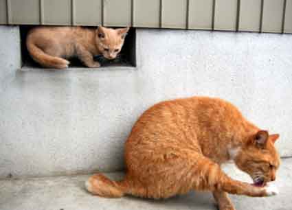 お昼過ぎ、雨が小降りとなっていた時、親ネコのタマと子猫のチャトランが遊んでいました♪