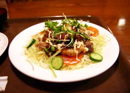 キャベツの上に照焼き風の鳥肉がカットされてのっています♪