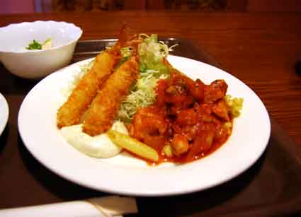 今日の「日替りランチ」650円は、「チキントマト煮とエビフライ」そして「湯豆腐」でした(^ ^ ;♪