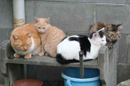 左端がボス猫のタマ、右に子供のチャトラン、その右がシロとキジトラでタマの子供のミケの子供です♪