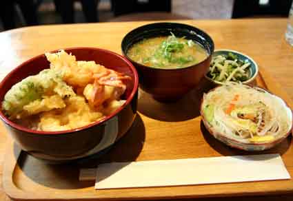 今日の「日替りランチ」700円は「天丼」と「具たくさん汁」、「マロニーの酢の物」でした(^_^)~