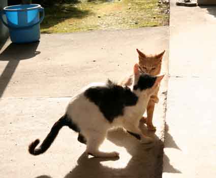 朝日を浴びてシロとチャトランが戯れあっていました(^ ^ ;