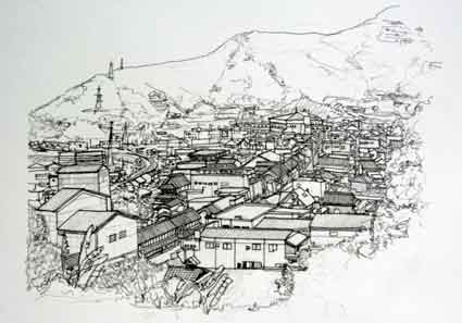 アップしたイラストは、昨日の昼休みに仕上げた(爆笑)「貞光の町並みスケッチ」です(^ ^ ;
