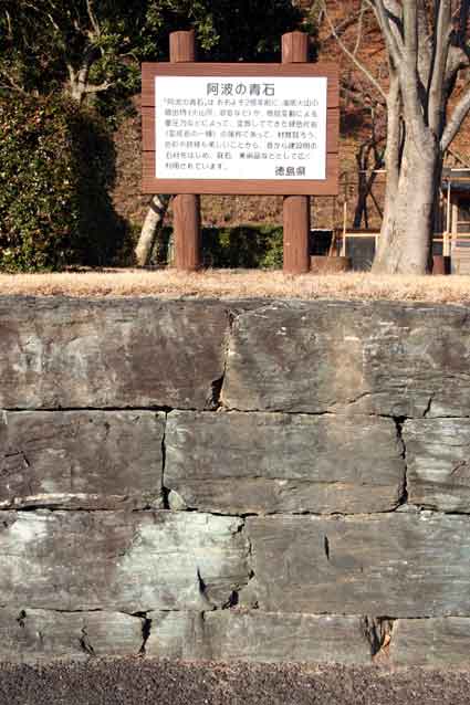 「阿波の青石」は、おおよそ2億年前に、海底火山の噴出物(火山灰・溶岩など)が、地殻変動による重圧力などによって、変質してできた緑泥片岩(変成岩の一種)の属称であって、材質堅ろう、色彩や紋様も美しいことから、昔から建設用の石材をはじめ、庭石、美術品などとして広く利用されています。