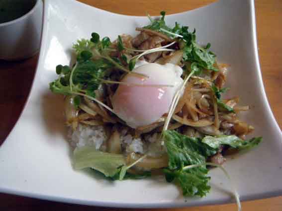 ごはんの上に、シャキシャキ野菜、その上に焼肉、そして温泉玉子がのっています!!