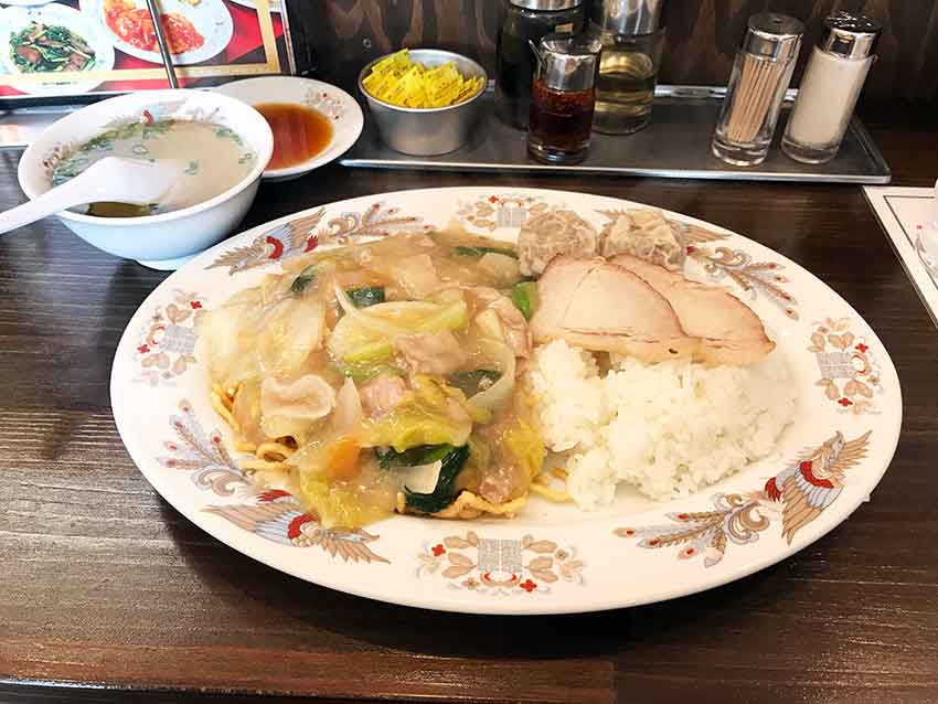 「揚げ麺」に「野菜たっぷりのあん」、「焼豚」「焼売」付きです♪