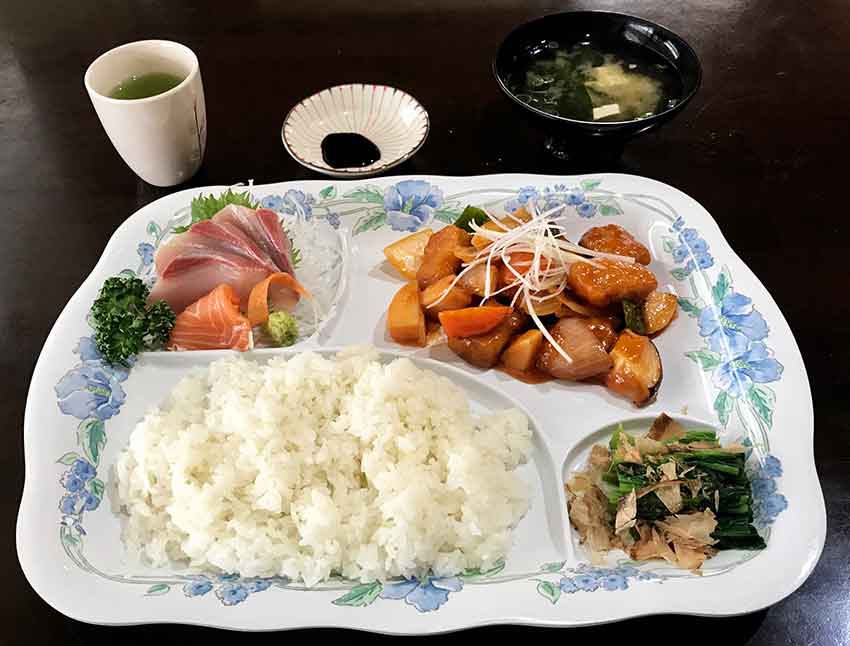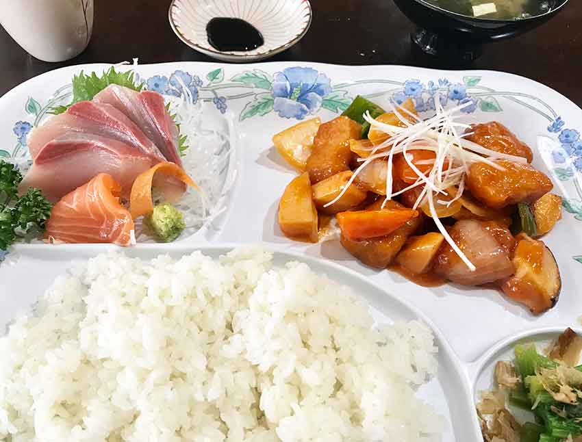 「酢豚」に「刺身」に「ほうれん草のおひたし」です♪