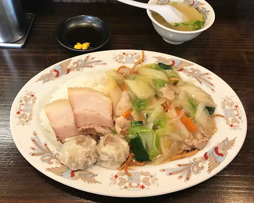 「ごはん」に「揚げ麺」、野菜たっぷりの「あんかけ」、「シュウマイ」2個と「チャーシュー」2枚ヽ(^o^)丿