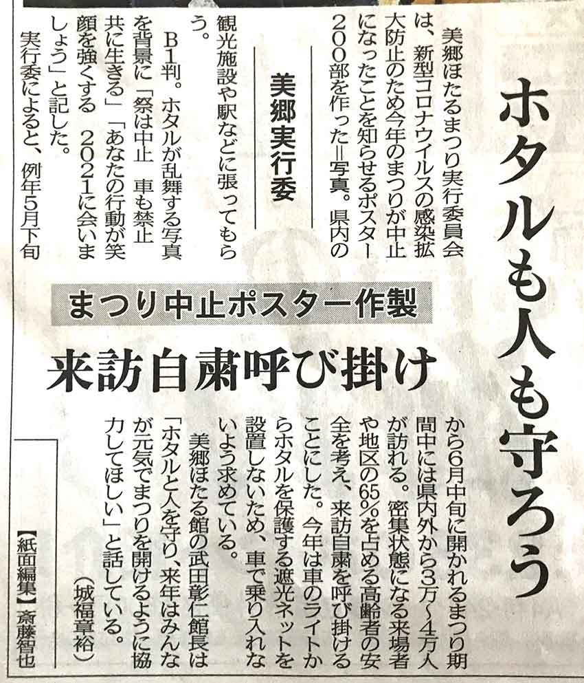 今朝の徳島新聞に「美郷ほたるまつり」中止の記事が・・・・!!