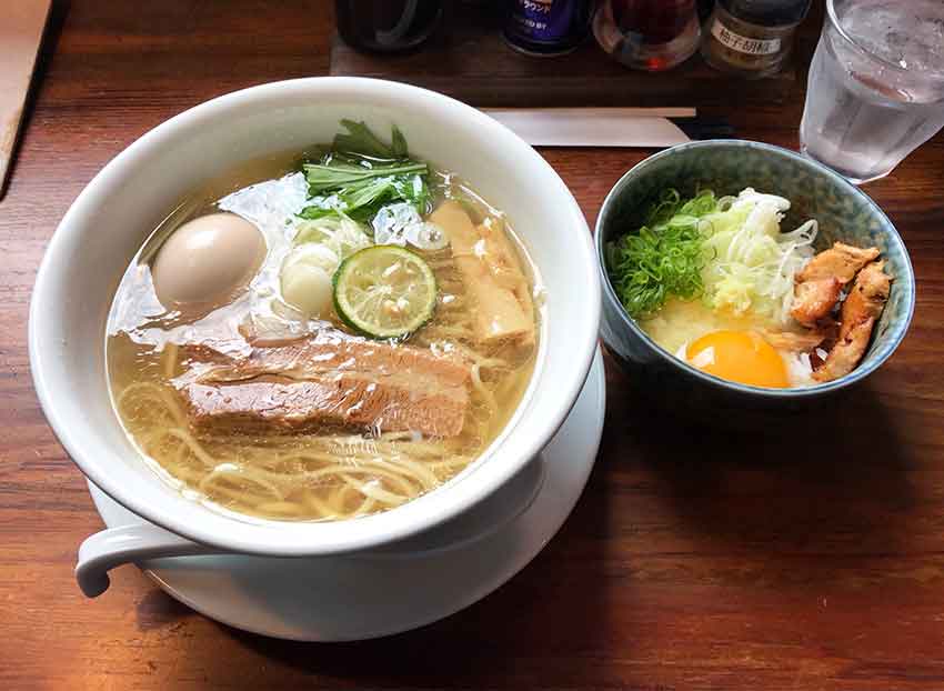 「鶏塩温玉らーめん」と「ミニ玉子かけ丼」です♪