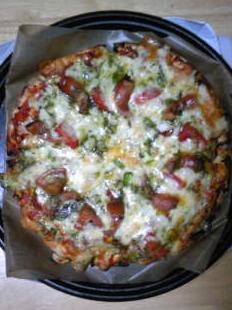 わたくし手作りの【ピザ】です なにもかも乗っけて ボリュームたっぷりサイドメニューも はだしで逃げ出す勝負ピザです(さすがにくどいね、はは) 手抜き とか 洗い物少ないから とかい わ な い の ってか いわせなぁ~い (by 姫ちゃん) あぁ・・・収拾がつかないよう