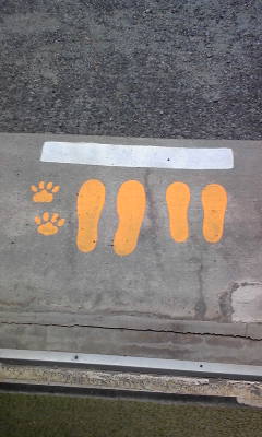 師走。 そう思うだけで 気ぜわしいけれど。友人宅(酒屋さん)へお届けものに寄った際の帰りに気が付きました。【止まれ】の足型マーク。右から 子供・大人・招き猫(!) の足型だって (笑 )写真を撮らせてもらった後で招き猫 の隣に立ってみました