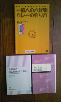 21日(木)に図書館で三冊。 魚柄仁之助 著 冷蔵庫で食品を腐らす日本人 「それはわたし」と たんご 言い・・・( 反省 ) 清水義範 著幸せになる力 一億人の大好物・カレーの作り方これ続けて二回目。スープカレーの作り方や カレー粉の調合がお役立ち。案の定、読んでるうちにカレーが食べたくなってきた・・・