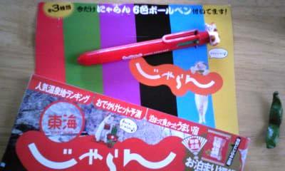 わ~!【 にゃらん 】 が ついに我が家に!どなたかのブログで見かけて、数ヵ所のコンビニ・書店を探して回るも オマケ付き【じゃらん】には出会えず、「いいにゃ~ほしいにゃ~」と、指をくわえて (よだれはたらさなくてよ) いたのだけどあきらめかけた拍子に、 ひょんなところで手に入っちゃった。 にゃらん三種類のうち、そこには二種類があった。【じゃらん】一冊300円。一冊に にゃらん一匹。・・・危うく同じ雑誌を二冊購入してしまうところであった。(家人がいなければ買っていたでしょう) 選ばれし にゃらんは このコでぇす♪うたたね・にゃらん。 風呂上りですかね?6色ボールペンって初めてだ。 毎日の新聞チェックに使おう。にゃらんクン、うたたねしながら がんばってくれたまえ。 おっと、置き去りだったよ。【東海じゃらん】本誌の特集は「東海人気温泉地ランキング2010」出不精(デブ症にあらず)たんごは これをお風呂で読んで温泉に行った気分に浸ろうっと♪(はぁ~ 安い安い♪)