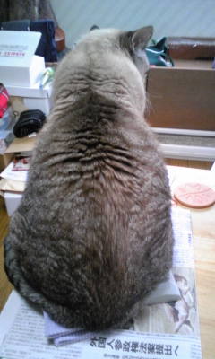 太猫さんよ。そこ、テーブルの上・・・(いつものことだが)そんでもって、DVDのリモコンと ワタクシ愛用の指なし手袋(一応シルクだぞ!)・・・ そんでもって、今日の新聞。808勝の魁皇も 引退を決めた千代大海も おしりの下・・・手袋はほっかほかになってて、(少しは)ありがたかったけどリモコンはあっためなくていいんだよ~それからさ 贅沢言って悪いんだけど・・・おしりの下はちょっとカンベンしてください。