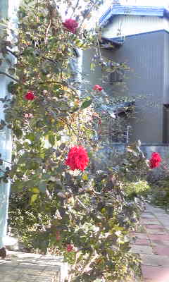 薔薇が咲いてる玄関の前 昨シーズン、思い切って剪定したのが功を奏したのか(それが常識のようですが)それとも暖冬の影響かこの時期異例の乱れ咲き?(・・・というほどでもないけど 例年は咲いても1~2輪だから)ほんとうは今のうちに冬の剪定をしなきゃいけないんだけど・・・咲きそうなつぼみもたくさん控えてるしこのまま楽しみたいなぁ(この甘さが私がグリーンフィンガーになれない所以のひとつでしょう) おはようございます。ほんとうの色はもっと真紅なんですよ
