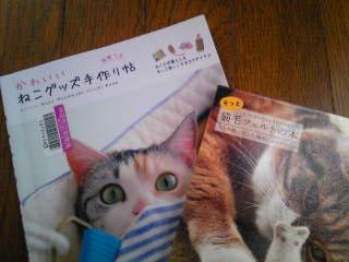 今日図書館に返却する本 ( の一部 )猫の写真も多くて パラパラめくって見るだけでも楽しい。右の「猫毛フェルト」の本!これは第二弾だけど、第一弾(購入済み)が出たとき「猫毛でこんなことできるんだ!してもいいんだ!」と、目からウロコが落ちたもんです。 特に換毛期のブラッシングで出る抜け毛(×2匹)は量がハンパなく、一回分づつ丸めて ジップロックに貯めてるのを見た家人が「糸に撚ったらセーターくらい編めそうだな~」というくらい。さすがにセーターはムリやろ~そんなには抜けてへん~(←ツッコミはナゼか関西弁で)「いや・・・人間用じゃなくてネコ用の・・・」ネコに猫毛のセーターはいらんやろ~ (←大木こだまひびき?) ・・・とにかく貯まる一方なので、虫がわくのを恐れて おととし思い切って処分したら・・・その少し後に出会ってしまった・・・。猫毛フェルトの本 惜しい!今思えば 猫毛丸ごと洗濯して、防虫剤でも入れてとっておけばよかったな。と、いうのも我が家の猫たち 年のせいか昨年あたりから まとまって取れる毛が極端に少なくなってきたので。保温機能のある下毛がしょぼくなってきたということは・・・家人のアイデア(ネコに猫毛のセーター)もまんざらではなかったのかもね。 これくらいなら作れそうかな?(もっと猫毛フェルトの本 より) 猫毛の有効利用を かねてより思案している方、愛猫の抜け毛を捨てるのが忍びない方におすすめします。(セーターは載ってません。念のため) 猫毛フェルトではないけどカラー(付け襟)とかスリングとか買うと結構なお値段のものが 自分で作れるのはいいね♪