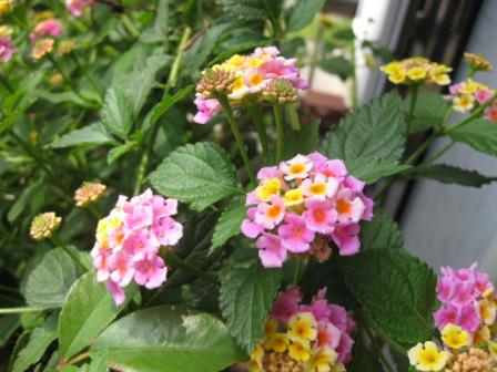 よく咲くなぁ (感心)【ランタナ】何年か前に いつのまにか赤バラの横に生えてきて、大株になりました。元は おそらく鳥の落としモノでしょう芽が出て、なんだろなんだろ・・・と思っているうちにただものではなさそうなポップな花が咲き出して、名前を知るに至りました。和名がシチヘンゲ(七変化)っていうのは実は今日調べて知りました (^^ゞ確かに 咲き進むにつれて色が変わるように見えます。 花の後にできる実もベリーのようでかわいいけど、タネ本体は有毒(ランタニン)らしいです