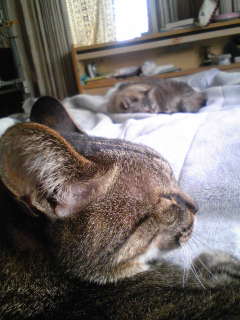 ひどい吹き降りの一日。南側は雨が打ち付けてくるので こんなありさま。・・・網戸が少しはきれいになるかも?(でもガラスは汚れる) その頃の細猫は何やってんだか (^_^;) ・・・あ!立った!細猫が 立った!!あ、爪が引っかかった・・・。・・・・・・・・・・・・・・・・・・・・・・・・・・・・・・・・・・・・・・・・・・・・・・今日は年に三回ほど回ってくる ゴミステーションの掃除当番なんです。よりにもよって、こんな日に!止み間を狙っているのに、そんな気配は全くなくていたずらに時間だけが過ぎていく・・・(ヒマってことね)・意を決して 嵐の中、七つ道具の中から ほうき と ちりとり をチョイスして出かけたところ、すでに雨で流されて いつもよりスッキリサッパリきれいになってた。ラッキ~♪(往復する間に 横殴りの雨でびしょぬれになった ってコトは置いといて) その頃の太猫どこ吹く風