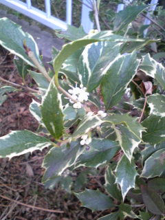 敷地の鬼門に植えてあるヒイラギモクセイに花が咲いてました。苗木を植えて以来十数年、初めて花を見た・・・それもけっこうたくさん。斑入り葉に小さい白い花は 遠めには目立ちません。こんな時期に咲くのも知らなかった・・・私が気づかなくても たぶん毎年花をつけてたんだろうなぁ。葉のギザギザに注意しながら 鼻をぐーっと近づけるとスッといい香りがしましたよ。