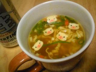 家人が東京へ旅立ったので 家には私ひとり。(基本的にひとりの時間のほうが多いけど)のんびりしても良かったのに、いつもよりたくさん働いたような。自分軸で動くとはかどるから、ついつい・・・。それで・・・晩ご飯を食べそびれちゃった。少し遅かったので そのまま寝てしまうのが正解って気もしましたが(ああ、そういえばアレがあった)と頭に浮かんじゃったので・・・珍しく夜食をば。MUG(マグ)うどん・豚カレー味を ビール付きで。(申し訳程度に刻みネギを追加)一食分(110キロカロリー)だけヨ~ の、つもりがお湯が余ったのをいいことに、もう1個追加投入。(できごころぉ~!)結果、大きめマグにてんこ盛り・・・(笑)※画像は撮影用に調整済みすきっ腹に じんわ~り沁みるうまさを堪能しました。こぶたがウインクしながら 「これでアナタもお仲間ね♪」 とささやいております・・・ きざみきつねと一個づつ食べ比べてもよかったかな~(反省の色なし)