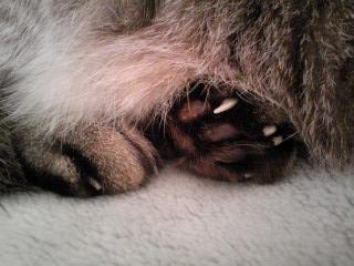 ありゃ。爪が一本伸びてますねぇ。後ろ足の爪はなかなか切らせてもらえないんだけどほうっておくと肉球に先が刺さっちゃうから・・・ 「遠慮しときます」・・・了解しました。(やっぱりね)この後寝込みをおそわれ、あえなくプッチン!される太猫でした。