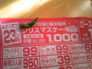 うわぁーーーっっっ!!完全に出遅れました!(というか、すでに問題外・・・)なぜ、どーして、23日にこのチラシに気づかなかったの・・・くく・・・痛恨の極み・・・昨年の轍(※千円のクリスマスケーキとは? )を踏まないよう今年はイチゴも忘れずに買おうとはりきってたのに。でもよく考えてみたら、23日に買っても今日まで私ひとり。いかんともしがたく・・・来年こそは!とココロに誓うたんごでした。 あ、そうだクリスマスカードが一通来てました。ひと目見て(え~?)と思っちゃったけど、じっくり眺めていたらなんだか笑いがこみ上げてきました・・はは♪メリークリスマス!