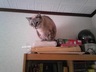 PCに向かって仕事をしていたら、後方でドガシャーーーン!!・・・と尋常でない音が。すわっ!と振り向くと、本棚の上に「むふぅ~!」鼻息荒い太猫が・・・うわ~足場悪いのに、よくそんなところに・・・めずらしい(太猫にしては)。 ・・・およ?まだ上を目指すつもり? 飽くなき挑戦?(これ以上は天井のシーリングライトしかありません) 「早く降ろしてぇ~」やっぱりか(笑)脚立持ってくるから待ってなよ~! (被害は最小限にくい止めねば)