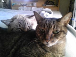 アウトドア派・細猫まぶしさのあまり、にゃん相がちょっと・・・ インドア派・太猫こんなところに小さいアザラシが !(笑)