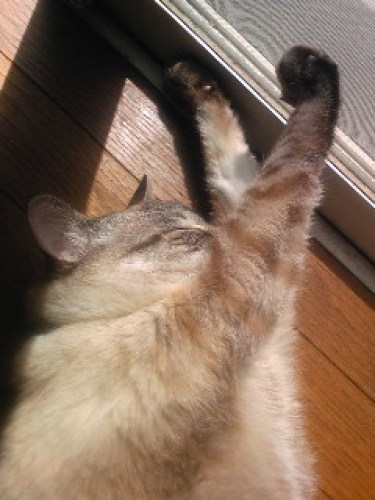 桜は五分から七分咲きのようです。今日は少し気温が下がって開花もブレーキがかかったかな?日中は晴れて風の強い一日。 桜も風もどこ吹く風(あぁくどい)猫はええねぇ・・・ さ、今のうちに仕事しよ!とっとと片付けないと、おちおち花見にも行けん。