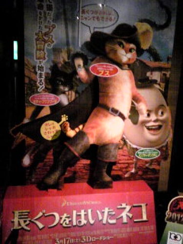 すご~く久しぶりに映画館で映画鑑賞しましたよ。 『長ぐつをはいたネコ』おもしろかったです。意外にも(?)アクション&ダンスシーンが見応えありました。ましてやネコスキーですから♪主人公プスは イケテルネコちゃん・ファンタジー部門のナンバー2を獲得!(審査員:たんご)(ちなみに首位は『猫の恩返し』のバロン、同率2位で『夏目友人帳』のニャンコ先生)3D吹き替え版でしたが(それしか選択肢がなかった)観賞後は案の定おめめが疲れ、おつむがウラウラしました~(ま、たまにはよか) そういえばこの前に、最後に映画館で観たのは2005年の『Shall We Dance?』(その前は1996年の『Shall we ダンス?』)タイミング悪くて行けなかったけど『のだめカンタービレ』も本当は映画館で観たかった。たまたまちょっとだけだけど、なんとなく竹中直人の影がつきまとっているな(笑)(※プスの声優も竹中直人)