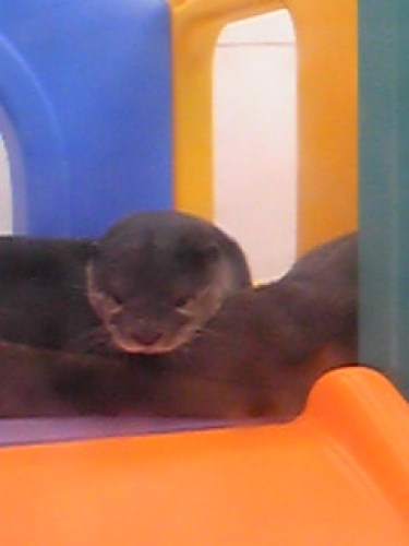 コツメカワウソの あくび。 「・・・あむ」 コツメカワウソの肩乗り。濡れた体を飼育員さんで拭いて乾かしているということです。 「・・・ニャにか?」