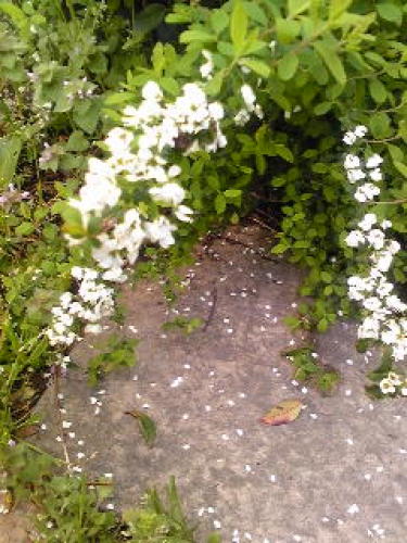 朝から晩までザーザーとよく降りました。花散らしの雨。今が盛りの桜も気になるけど 我が庭では雪柳が・・・ 庭中に小さな花びらが星のように散らばっています。 そろそろ次の花にバトンタッチです。 (画像は翌朝撮影しました)
